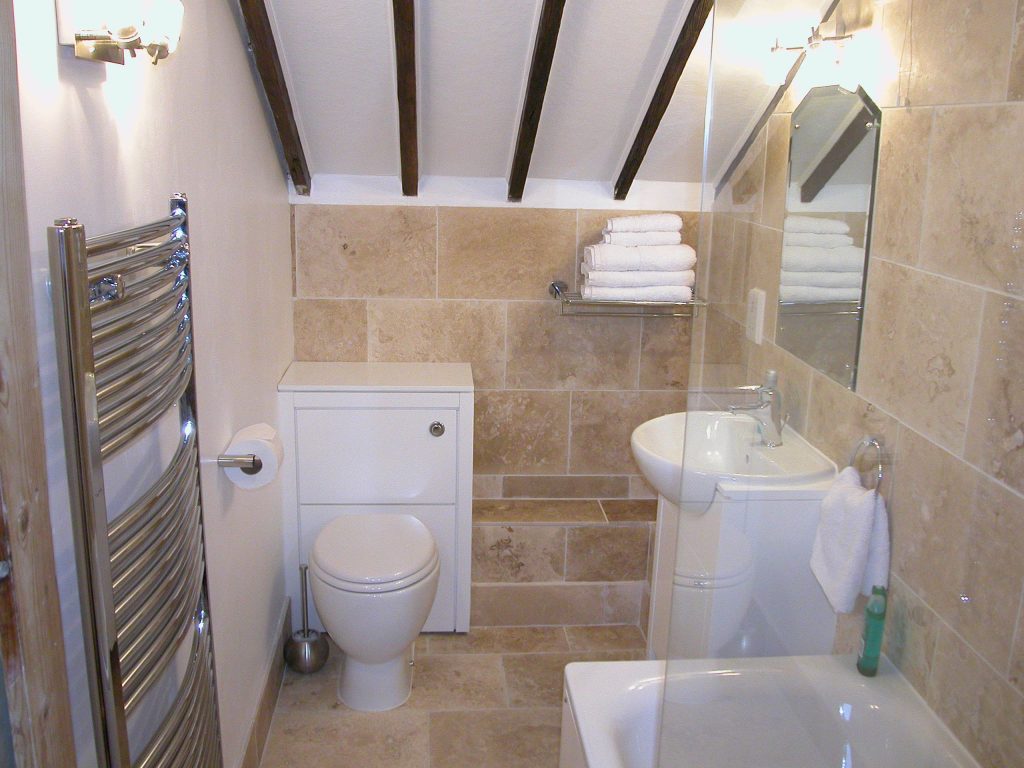 The bathroom is en-suite with bath (4ft6) + over-shower, basin and lavatory, travertine marble floor and wall tiling, heated towel-rail and halogen lighting.