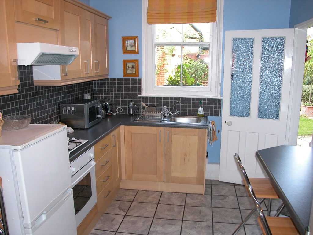 The kitchen is equipped with fridge/freezer, cooker and microwave which can be used for making coffee and tea (provided) and warming and eating take-aways etc; though we discourage full scale cooking. The kitchen counter-top seats 4, 5 at a squeeze. A high chair is available if booked in advance.