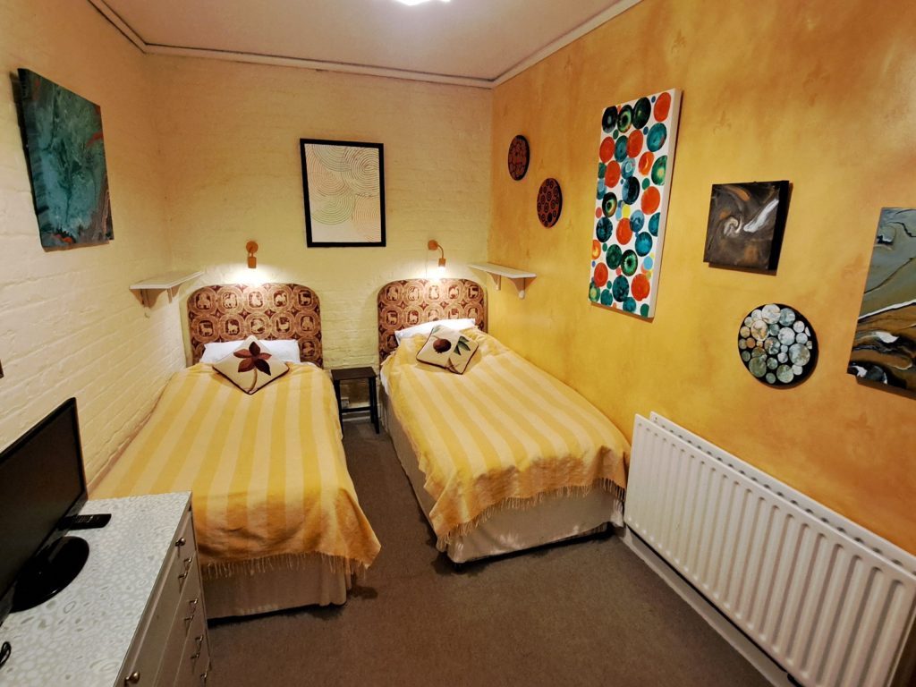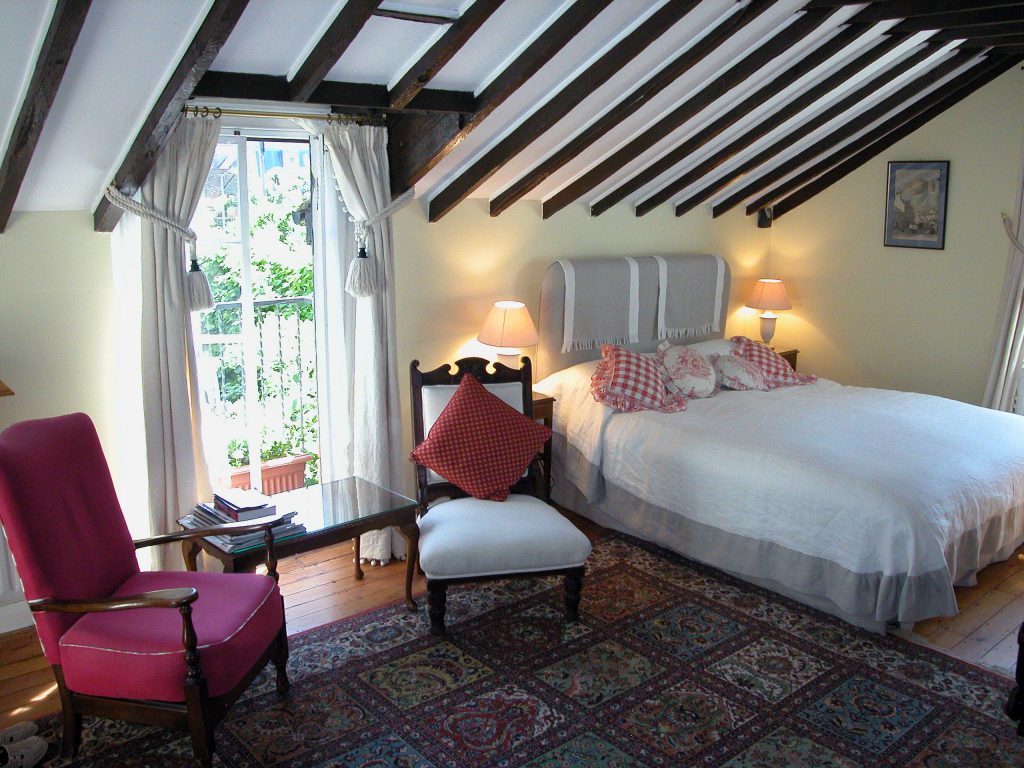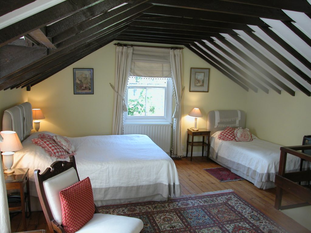 The main bedroom is a large (20ft x 15ft, 6.4m x 4.5m) room on the first floor with original oak beams and French windows giving out to the garden. There is a double (5ft) and single bed, easy chairs, wardrobe and chest of drawers. Ample space for unpacking. You also have a radio, television, free wifi and hair dryer. A baby cot (crib in US English) + high chair is available if booked in advance.